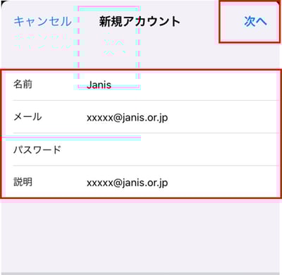 (7)「新規アカウント」画面が表示されるので、以下の通りに入力