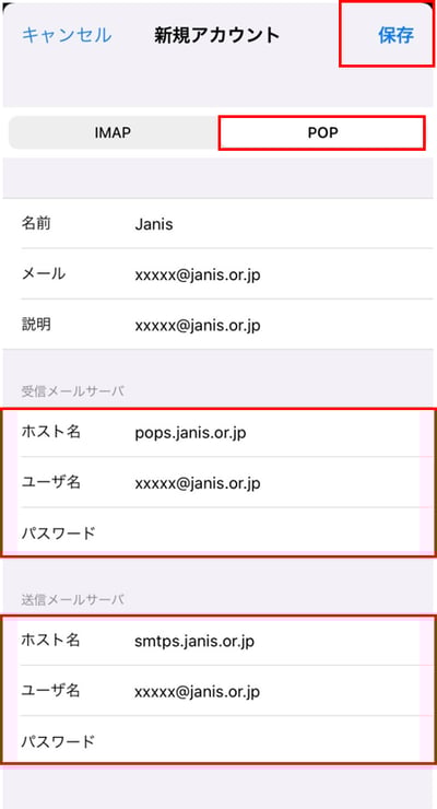 (8)次の画面が表示されたら、「POP」をタップし、以下の通りに入力